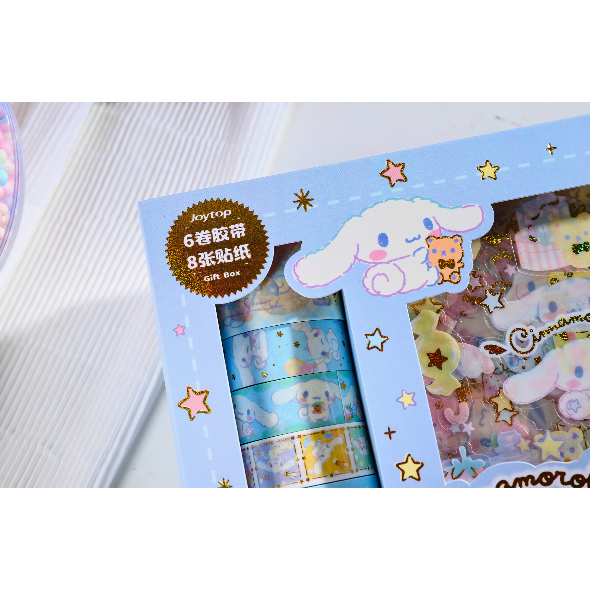 Breng magie en schattigheid in je creatieve projecten met deze Sanrio Cinnamoroll Sticker & Washi Tape Gift Box! Dit is een door Sanrio officieel geautoriseerd product, wat betekent dat je gegarandeerd een authentiek en hoogwaardig artikel ontvangt. Deze luxe set is perfect voor journaling, scrapbooking en het decoreren van je agenda of notitieboek. De prachtige goudfolie-accenten geven een verfijnde en speelse uitstraling aan je ontwerpen.